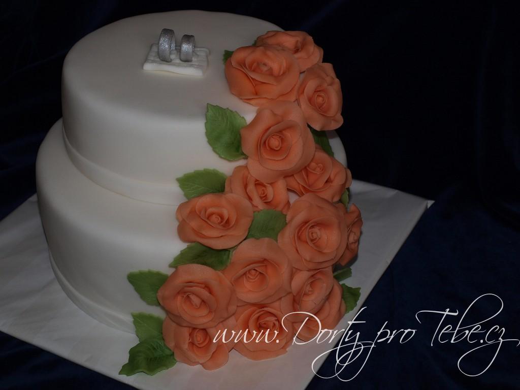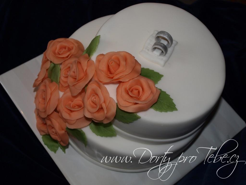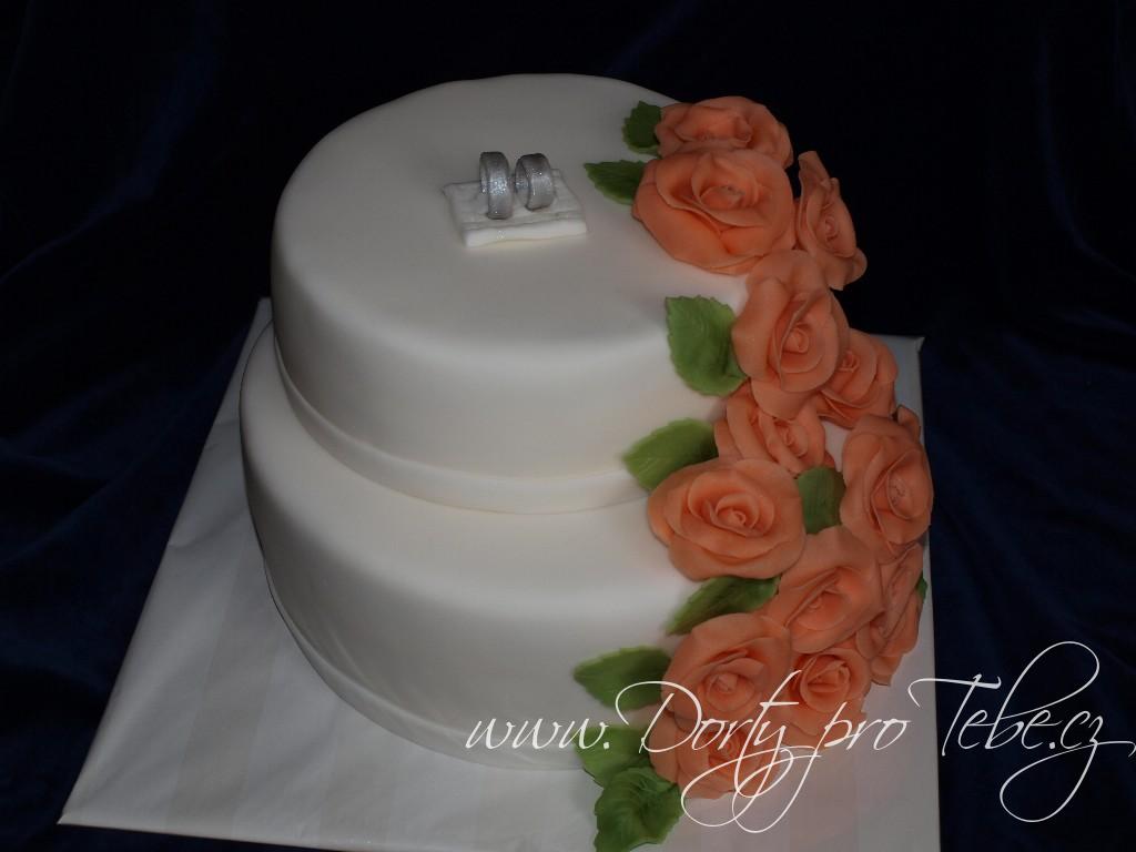 Dort s pařížským krémem a jahodovým frutafilem.Potažen je bílou hmotou White iceing.Růže i prstýnky jsou z mandlového marcipánu.