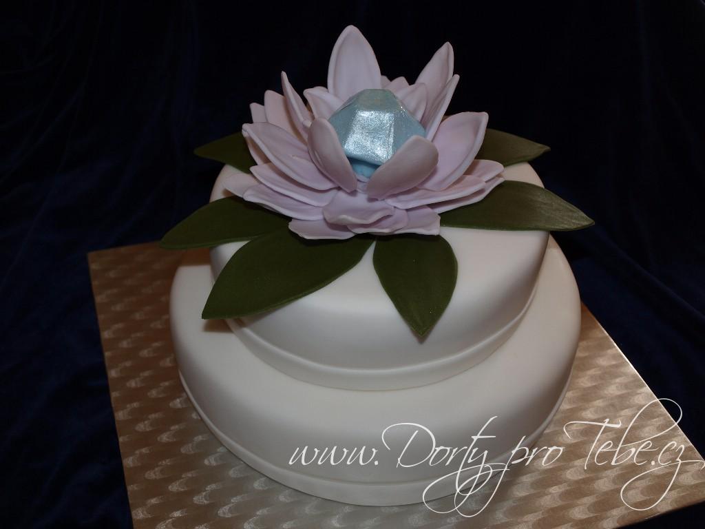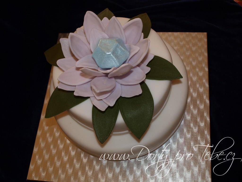 Svatební dort s lotosovým květem a modrým diamantem.Potah i květ jsou vytvořeny z fondánové hmoty White icing.