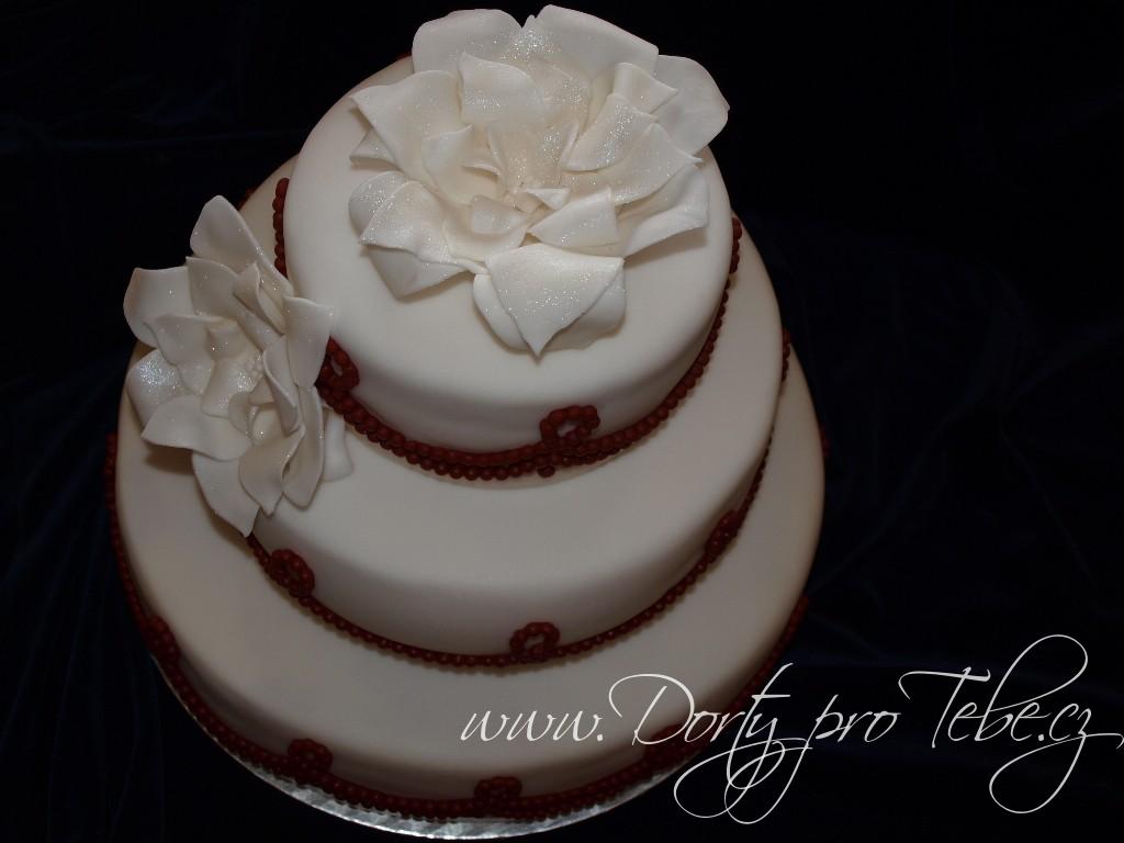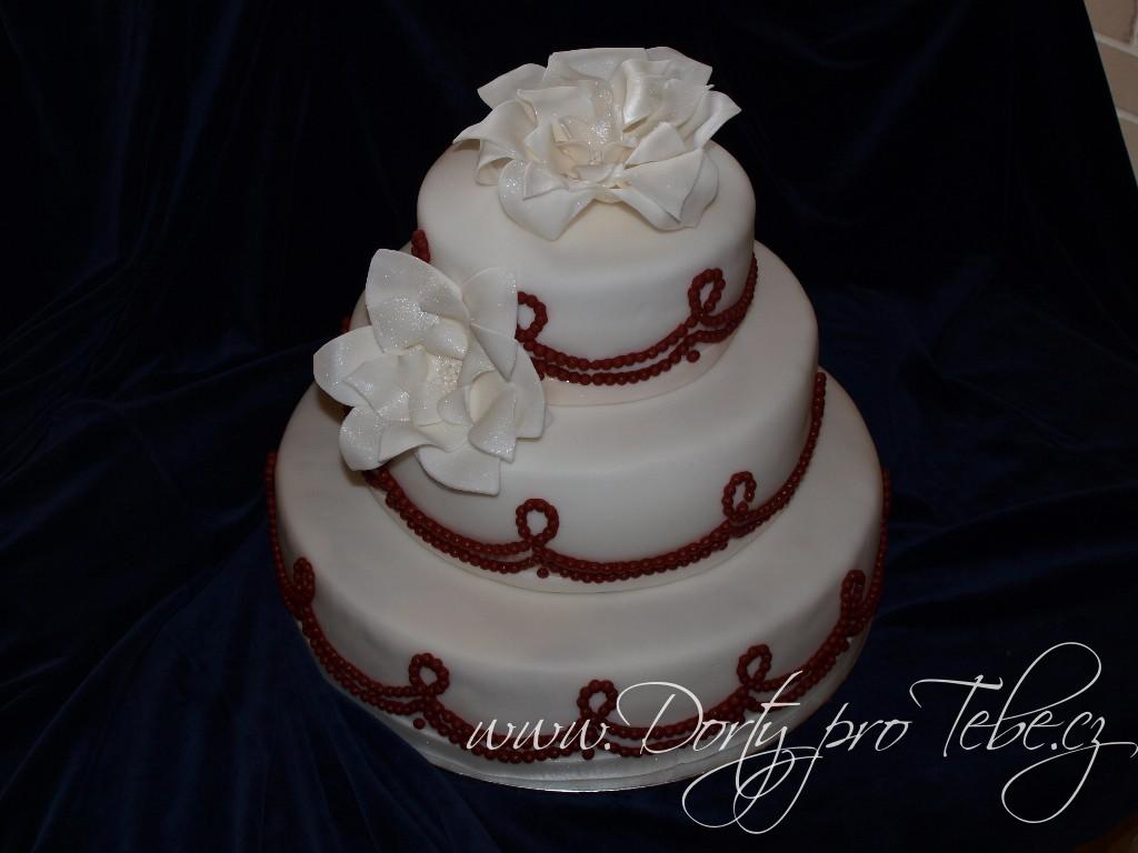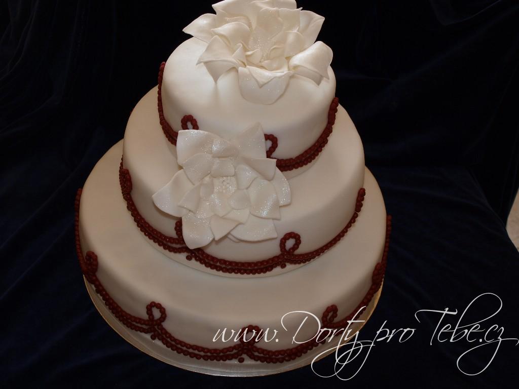 Svatební dortík s červenými marcipánovými korálky.Korpus měl kakaový,krém pařížský a kakaovovanilkový.Dort je potažen fondánovou hmotou White iceing. Hmotnost dortu 10,5 kg